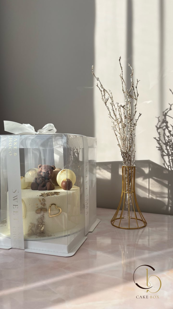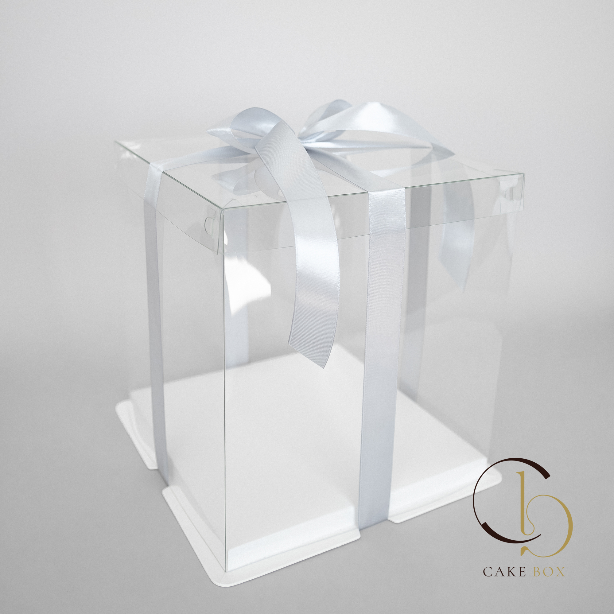 Коробка для торта с квадратным дном 25,5*25,5см и высотой 31см, в двусторонней защитной пленке. Материал - ПЭТ. Лента к коробке не прилагается.Подойдет круглая подложка D25-26см, либо квадратная 25см.