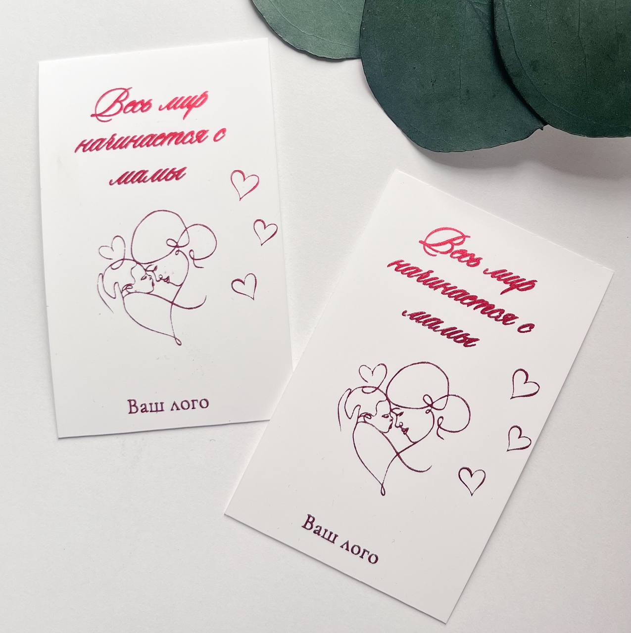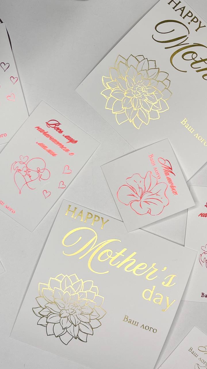 Индивидуальные открытки для вашей продукции, цвет печати - золото, серебро, черный, красный.
