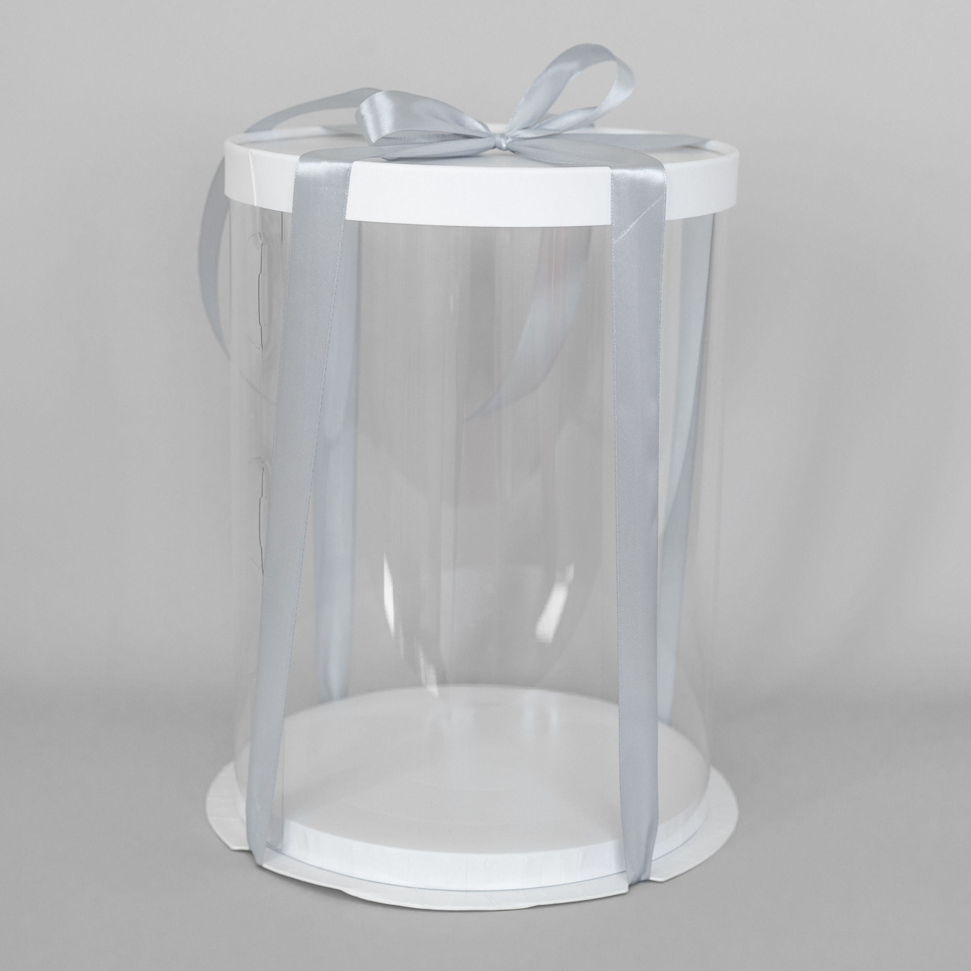 Коробка-цилиндр для торта D-26см и высотой 31см, в двусторонней защитной пленке. Материал - ПЭТ. Лента к коробке не прилагается.
